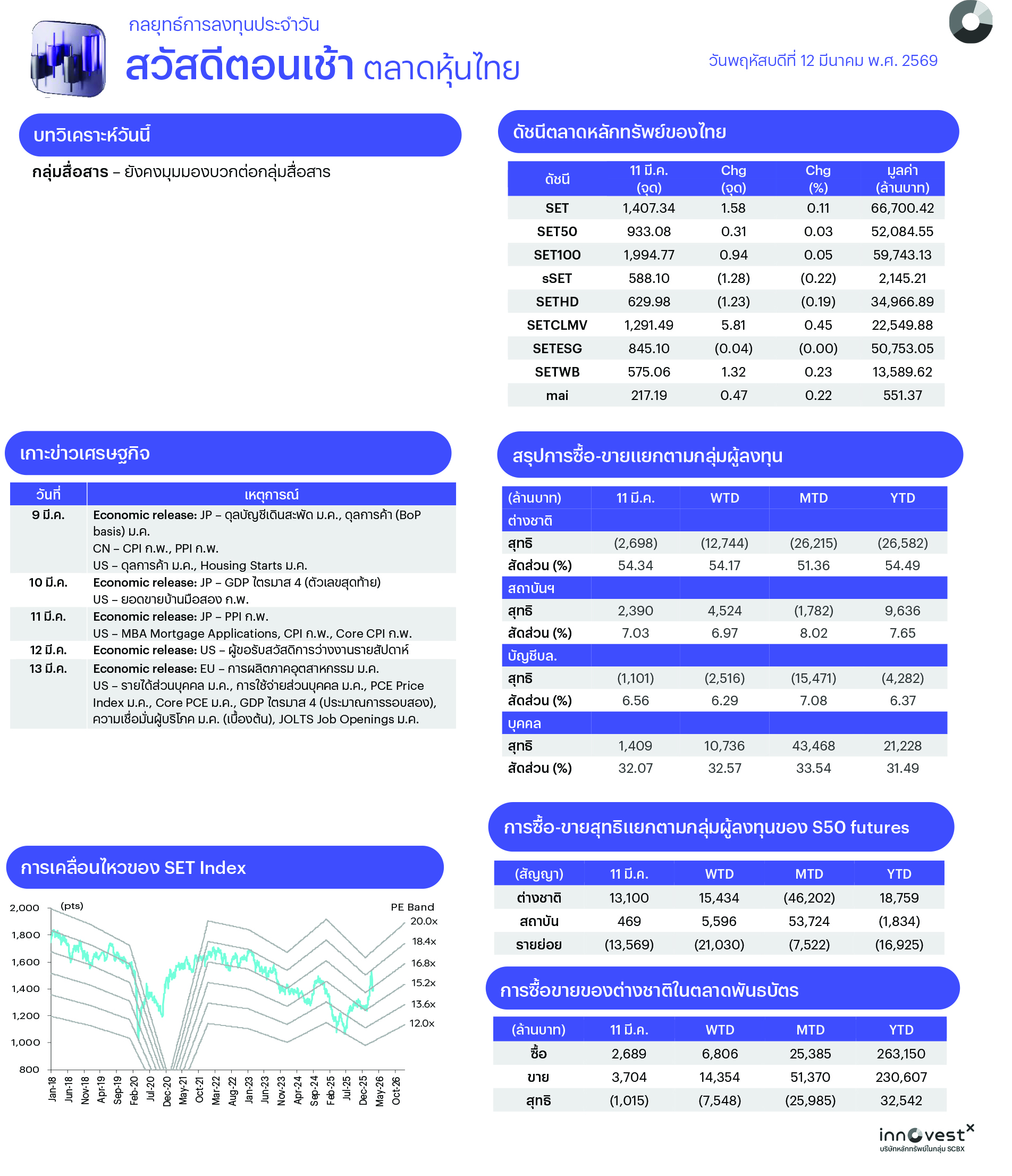 คาด SET แกว่งผันผวน ราคาน้ำมันปรับขึ้นหลังมีการโจมตีเรือในช่องแคบฮอร์มุซครั้งใหม่ แม้ IEA และสหรัฐฯ เตรียมระบายคลังสำรองน้ำมันครั้งใหญ่แต่ก็ไม่น่าจะเพียงพอ สร้างความกังวลเงินเฟ้อ แต่หุ้นพลังงานต้นน้ำน่าจะช่วยประคองตลาดได้บ้าง ขณะที่ต่างชาติขายสุทธิหุ้นไทย 5 วันทำการรวม 2.66 หมื่นลบ. ทางเทคนิคดัชนีดีดตัวขึ้นมาแต่ยังมีความผันผวนสูง บริเวณ 1430 เป็นแนวต้านในระยะสั้น หากยังไม่ผ่านมีแนวโน้มย่อตัวลงมาที่ ประเมินแนวรับ 1385/1375