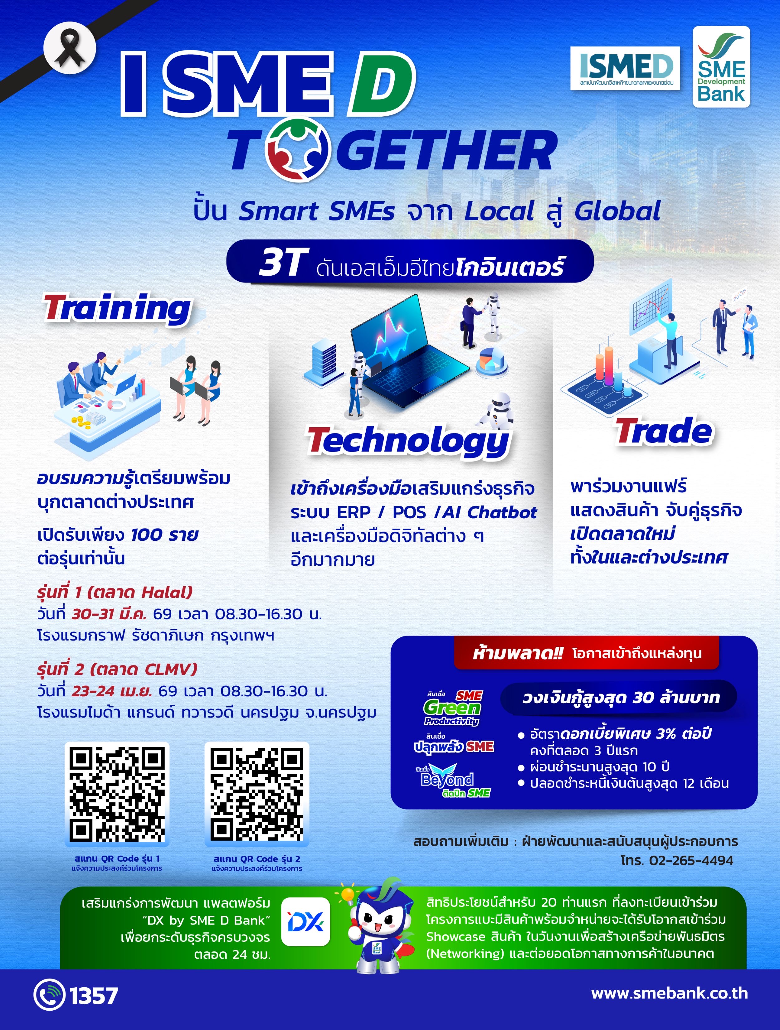 เปิดรับสมัครแล้ว รุ่นที่ 1 สำหรับธุรกิจเอสเอ็มอีที่ต้องการขยาย “ตลาด Halal” (มาเลเซีย อินโดนีเซีย ฟิลิปปินส์ และซาอุดีอาระเบีย) เปิดอบรมระหว่างวันที่ 30–31 มีนาคม 2569 ณ โรงแรมกราฟ รัชดาภิเษก กรุงเทพฯ กรุงเทพฯ และรุ่น 2 สำหรับกลุ่มต้องการขยาย “ตลาด CLMV” (ลาว เวียดนาม และเมียนมา) ระหว่างวันที่ 23-24 เมษายน 2569 ณ โรงแรมไมด้า แกรนด์ ทวารวดี นครปฐม จ.นครปฐม