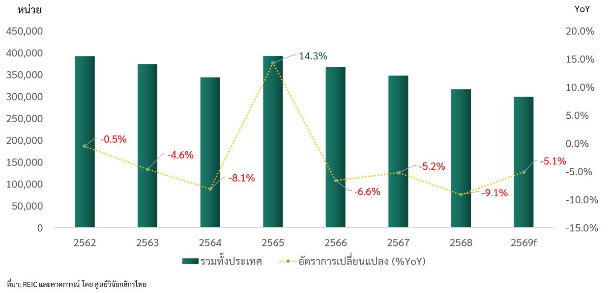 ศูนย์วิจัยกสิกรไทย คาดว่า ปี 2569 การโอนกรรมสิทธิ์ที่อยู่อาศัยทั่วประเทศจะมีจำนวน 3.0 แสนหน่วย ต่ำที่สุดในรอบหลายปี โดยหดตัว 5.1% จากปี 2568 (รูปที่ 2) แม้จะเป็นอัตราติดลบที่ลดลงจากปีก่อน แต่การโอนกรรมสิทธิ์ที่อยู่อาศัยติดลบหลายปีติดต่อกัน สะท้อนภาพตลาดที่อ่อนแอเป็นเวลานาน ทั้งนี้ ประมาณการนี้ เป็นมุมมองที่ระมัดระวังเพิ่มขึ้น โดยได้คำนึงถึงผลกระทบจากเหตุการณ์ในตะวันออกกลาง จากเดิมก่อนเกิดเหตุการณ์ที่ก็มองว่าตลาดจะหดตัวอยู่แล้ว