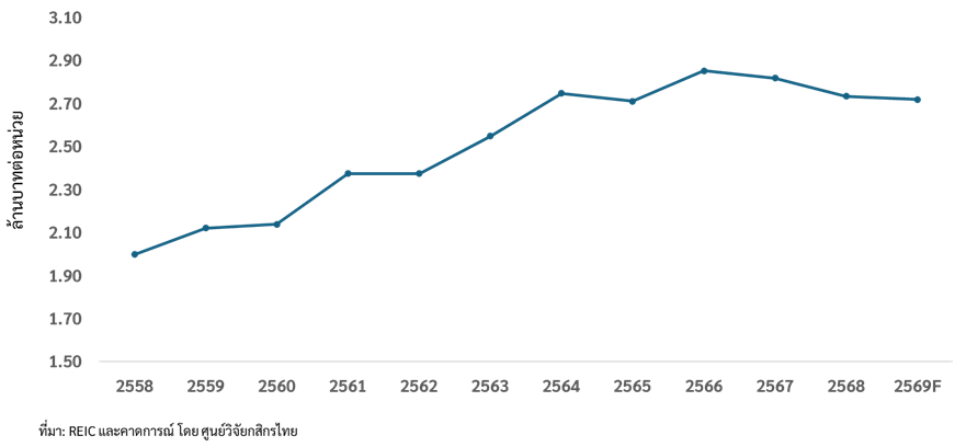 ราคาซื้อขายปี 2569 มีแนวโน้มปรับลดลงเล็กน้อย ผู้ซื้อปรับตัวโดยมองหาที่อยู่อาศัยในระดับราคาที่สอดคล้องกับกำลังซื้อ ราคาเฉลี่ยการโอนกรรมสิทธิ์ที่อยู่อาศัยในปี 2569 คาดปรับลดลง 0.6% (YoY) มาอยู่ที่เฉลี่ย 2.72 ล้านบาทต่อหน่วย (รูปที่ 4) นอกจากการปรับตัวของผู้ซื้อแล้ว ราคาที่ลดลงยังเป็นผลจากการแข่งขันที่รุนแรงเพื่อระบายอุปทานสะสมในตลาดที่มีจำนวนสูงกว่า 6 แสนหน่วย (รวมทั้งที่อยู่อาศัยใหม่และมือสอง) ทำให้ผู้ซื้อที่มีความพร้อมมีทางเลือกและอำนาจต่อรองในราคาได้