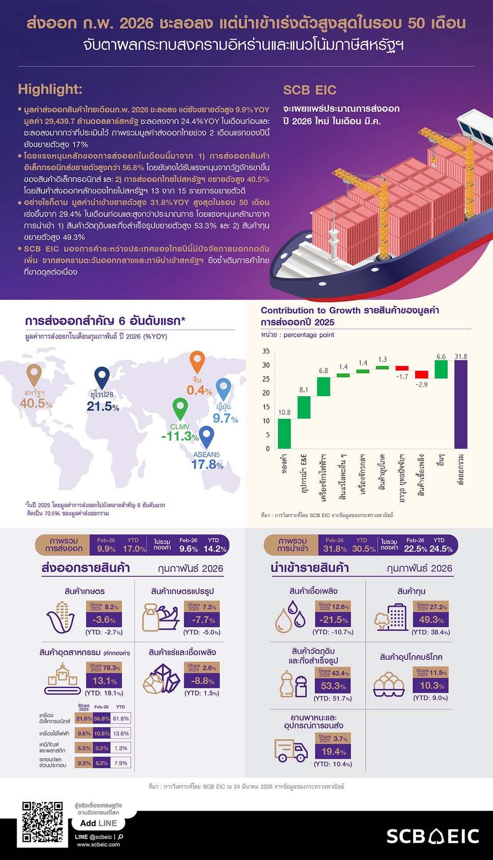 ทั้งนี้ SCB EIC อยู่ระหว่างการทบทวนแนวโน้มเศรษฐกิจไทยปี 2026 ทิศทางมูลค่าส่งออกและนำเข้า ภายใต้สถานการณ์สงครามตะวันออกกลางที่เกิดขึ้น โดยจะเผยแพร่ประมาณการใหม่ในช่วงปลายเดือน มี.ค. นี้
