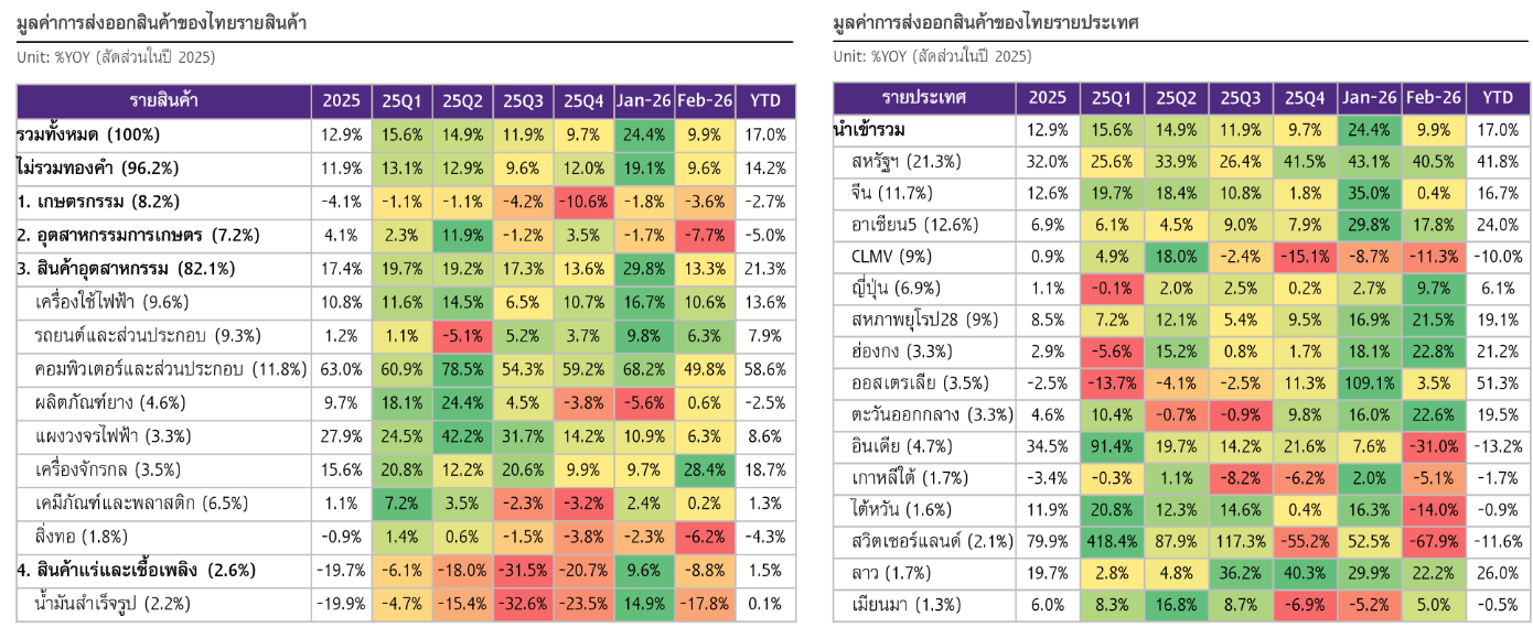 ส่งออกไทยเดือน ก.พ. 2026 ชะลอลง แต่ยังขยายตัวสูง 9.9%YOY มูลค่า 29,439.7 ล้านดอลลาร์สหรัฐ ชะลอลงจากเดือนก่อนที่เติบโตสูง 24.4%YOY และชะลอลงมากกว่าที่ประเมินไว้ (SCB EIC และค่ากลาง Reuters Poll มองไว้ 15.8%) มูลค่าส่งออกที่ปรับฤดูกาลแล้วหดตัวแรงจากเดือนก่อน -11.1%MOM_SA ภาพรวมมูลค่าส่งออกไทยช่วง 2 เดือนแรกของปีนี้ยังขยายตัวสูง 17% (รูปที่ 1 และ 2) ก่อนสงครามในอิหร่านเริ่มขึ้นตั้งแต่ 28 ก.พ.