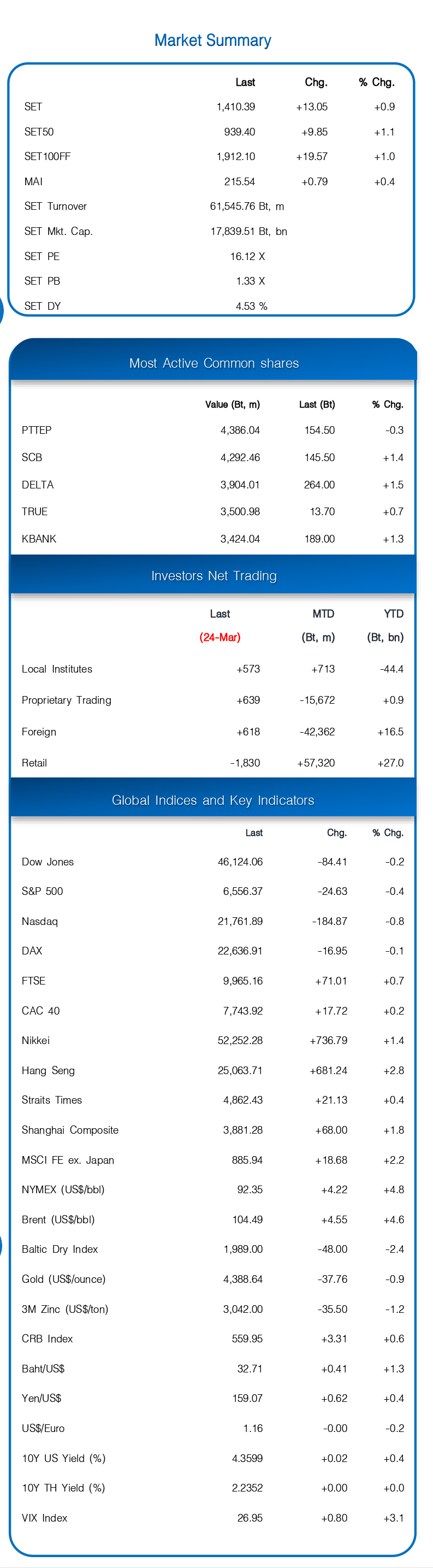 ทรัมป์เลื่อนโจมตีอิหร่าน 5 วัน – SET เปิดกระโดดขึ้นและแกว่งแดนบวกทั้งวันในกรอบ 1407-22 คลายกังวลสงครามหลังทรัมป์เลื่อนเส้นตายถล่มโรงไฟฟ้าอิหร่านไปอีก 5 วัน โดยทรัมป์อ้างว่ามีการเจรจาที่ดีกับอิหร่าน แต่อิหร่านปฏิเสธคำอ้างดังกล่าว ต่างชาติพลิกซื้อสุทธิเล็กน้อย 618 ลบ. และพลิก Long S50 Futures 9,131 สัญญา