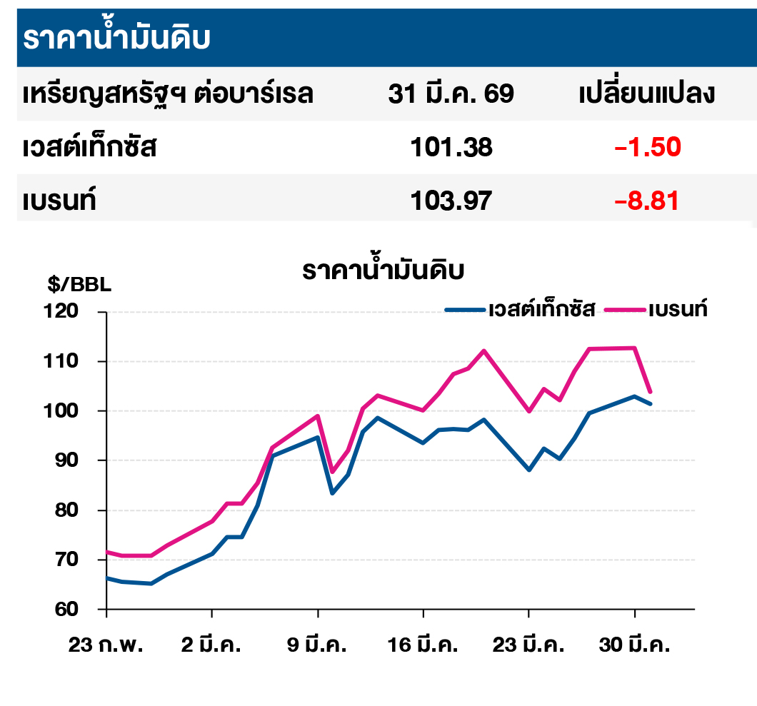 (-) ราคาน้ำมันดิบปรับลด หลังมีรายงานข่าวที่ไม่ได้รับการยืนยันว่าประธานาธิบดีอิหร่านพร้อมเจรจาเพื่อที่ยุติสงคราม ภายใต้เงื่อนไขหลักประกันที่ชัดเจน ได้แก่ การรับประกันว่าจะไม่มีการโจมตีซ้ำ, การคุ้มครองผลประโยชน์ของประชาชนอิหร่าน และ การชดใช้ค่าเสียหาย โดยการแถลงการณ์ดังกล่าวนับเป็นสัญญาณเชิงบวกครั้งสำคัญท่ามกลางสถานการณ์ความตึงเครียดในภูมิภาคตะวันออกกลางที่ยืดเยื้อมาเป็นเวลานาน