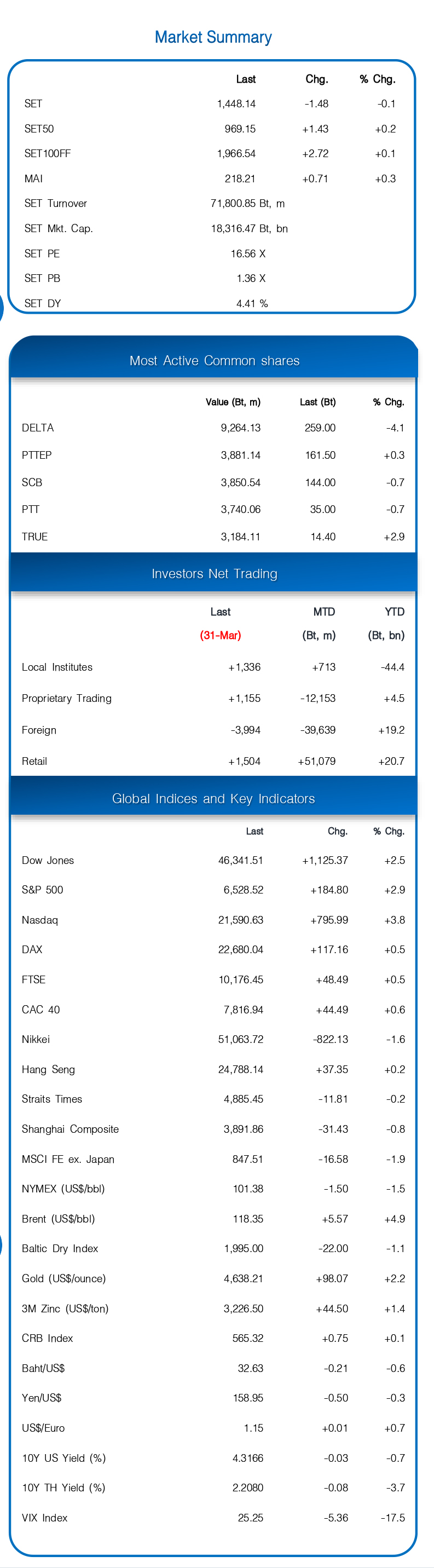 ขึ้นทะลุ 1460 – หุ้นโลกพลิกเป็นบวกจากสัญญาณยุติสงครามร่วมกันทั้งสหรัฐฯ-อิหร่านที่ชัดเจนมากที่สุดหลังสงครามผ่านมาแล้ว 1 เดือน ผสานกับรัฐบาลใหม่เตรียมแถลงนโยบายต่อสภา 9-10 เม.ย. ทำให้มีอำนาจเต็มบริหารปท. และ DELTA ผ่านพ้น Capped Weight 10% ใน Q1 ไปแล้ว แนวรับ 1440+/- แนวต้าน 1470, 1480