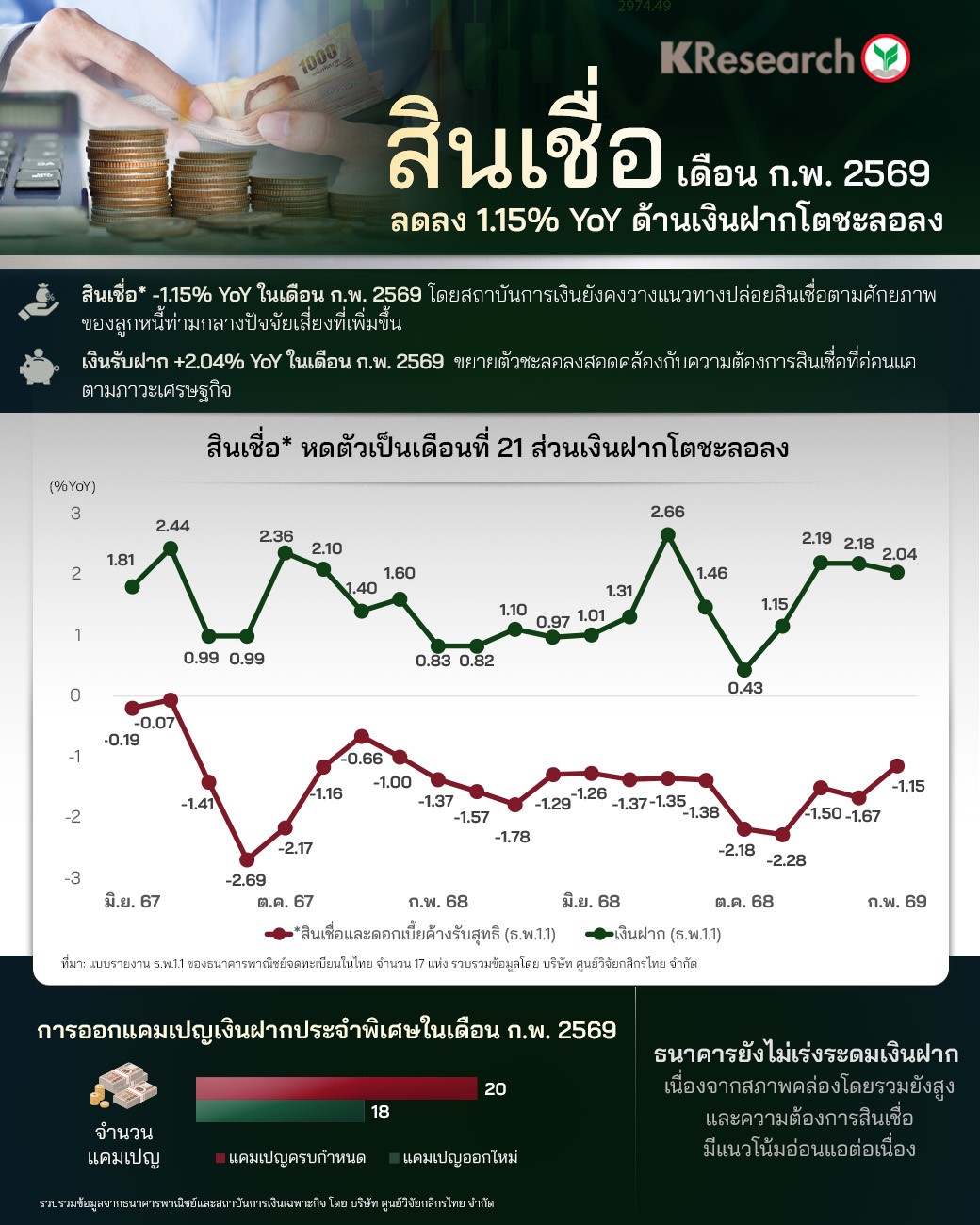 • ด้านเงินรับฝาก ณ สิ้นเดือนก.พ. 2569 อยู่ที่ระดับ 16.47 ล้านล้านบาท ขยายตัว 2.04% YoY เทียบกับ 2.18% YoY ในเดือนม.ค. 2569 สำหรับการออกแคมเปญเงินฝากประจำพิเศษในเดือนก.พ. 2569 นั้น พบว่า จำนวนแคมเปญออกใหม่ลดลงจากเดือนก่อนหน้า และส่วนใหญ่ยังคงเป็นแคมเปญระยะสั้น สะท้อนว่าธนาคารยังไม่เร่งระดมเงินฝาก เนื่องจากสภาพคล่องโดยรวมยังอยู่ในระดับสูงและความต้องการสินเชื่อมีแนวโน้มอ่อนแอต่อเนื่องตามภาวะเศรษฐกิจ