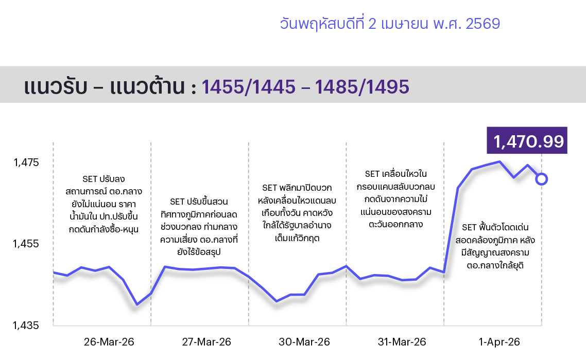 ช่วงสั้นมอง SET ยังผันผวนสูงจากแรงขายลดความเสี่ยงหลังสถานการณ์ในตะวันออกกลางยังตึงเครียด โดยทิศทางของ SET จะขึ้นกับผลการเจรจาเป็นสำคัญ โดยหากการเจรจาล้มเหลวหรือเกิดการเผชิญหน้าทางทหารรุนแรงขึ้นคาด SET มีโอกาสปรับตัวลงไปทดสอบจุดต่ำสุดเดิมหรือต่ำกว่าที่ 1,320-1,350 จุด แต่หากบรรลุข้อตกลงสันติภาพที่ถาวรคาด SET มีโอกาสปรับขึ้นไปทดสอบที่ 1,500-1,530 จุด สะท้อนการกลับมาของความเชื่อมั่นลงทุนและการฟื้นตัวของกำไร บจ. ที่เคยถูกกดดันจากวิกฤติพลังงานก่อนหน้านี้ ท่ามกลางความผันผวนจึงทำให้กลยุทธ์ลงทุนยังแบ่งตามระดับความเสี่ยงของนักลงทุน