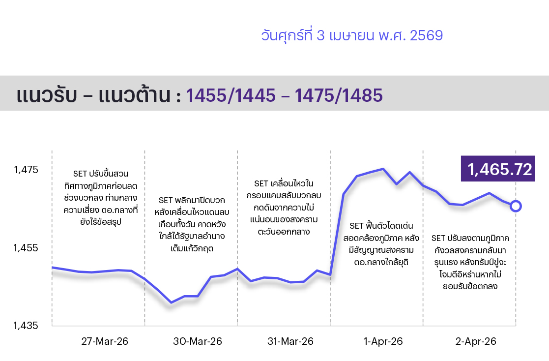คาด SET แกว่ง sideways-up คาดหวังช่องแคบฮอร์มุซจะเปิดใช้งานได้บางส่วนหลังมีข่าวอิหร่านและโอมานกำลังร่างข้อตกลงกำกับดูแล แต่ราคาน้ำมันที่ยังอยู่ในระดับสูง จำกัดกรอบการขึ้นของดัชนี อีกทั้งต้องระวังช่วงท้ายตลาดอาจมีแรงขายลดความเสี่ยงก่อนวันหยุดยาว ประเด็นติดตาม 6 เม.ย. ครม. ชุดใหม่เข้าเฝ้าถวายสัตย์ฯ และการประชุม ครม. นัดพิเศษเพื่อเห็นชอบร่างนโยบายรัฐบาล ทางเทคนิค ดัชนีมีแนวรับ 1455-1445 แนวต้าน 1475-1485