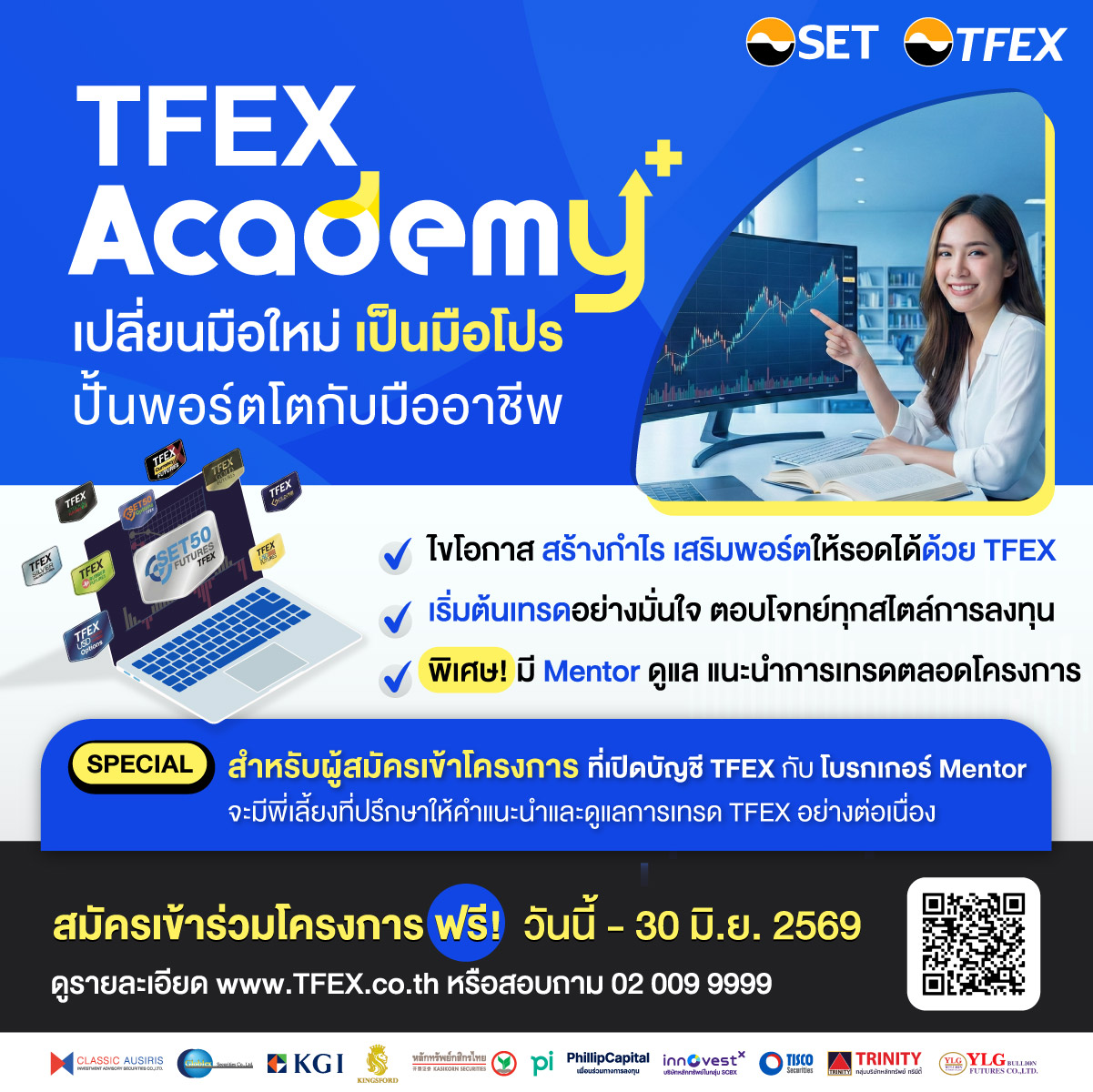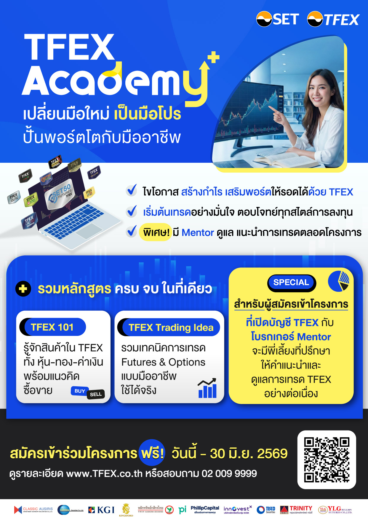 โครงการ TFEX Academy+ ชวนเรียนรู้การใช้ TFEX เสริมพอร์ต ใช้ได้ทุกสภาวะตลาด ตอบโจทย์ทุกสไตล์การลงทุน มือใหม่ก็เริ่มได้ สมัครฟรี! วันนี้ - 30 มิ.ย. 69