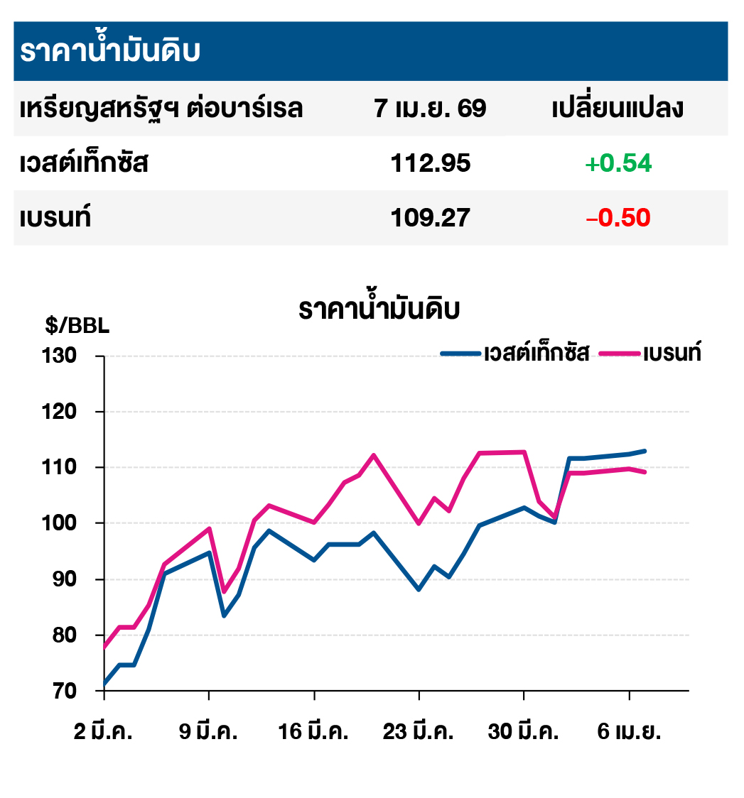 (+/-) ประธานาธิบดีสหรัฐฯ โดนัลด์ ทรัมป์ ได้ทำการขีดเส้นตายแก่อิหร่าน ในวันที่ 7 เม.ย. 69 เวลา 20.00 น. ตามเวลาวอชิงตัน หรือ 03.30 น. ตามเวลาเตหะราน เพื่อยุติการปิดล้อมน้ำมันในอ่าวเปอร์เซีย และเปิดช่องแคบ ฮออร์มุซอีกครั้ง โดยเมื่อใกล้ถึงเวลาที่สหรัฐฯ กำหนดไว้ สถานการณ์การโจมตีอิหร่านของสหรัฐฯ ทวีความรุนแรงมากยิ่งขึ้นตลอดทั้งวัน โดยมีการโจมตีทั้งสะพานรถไฟและถนน สนามบิน โรงงานปิโตรเคมี และสายส่งไฟฟ้า ในขณะเดียวกันมีรายงานเหตุระเบิดหลายครั้งบนเกาะคาร์ก ซึ่งเป็นสถานที่ตั้งของท่าเรือส่งออกน้ำมันของอิหร่าน โดยหลังตลาดน้ำมันดิบปิด ประธานาธิบดีสหรัฐฯ ได้ตกลงที่จะหยุดยิงเป็นเวลา 2 สัปดาห์ หากอิหร่านตกลงที่จะเปิดช่องแคบฮอร์มุซอีกครั้ง ส่งผลให้ตลาดซื้อขายล่วงหน้าของน้ำมันดิบปรับลดลงในวันที่ 8 เม.ย. 69