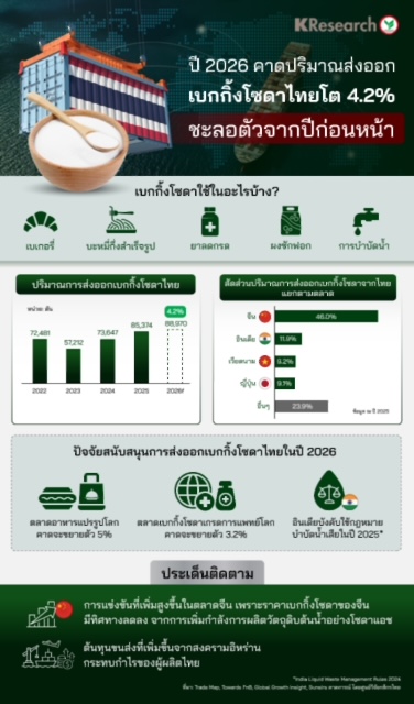 การส่งออกเบกกิ้งโซดาไทยยังคงเติบโตต่อเนื่อง แม้มีแนวโน้มชะลอลง โดยในปี 2026 คาดว่าปริมาณส่งออกจะขยายตัว 4.2% สอดคล้องกับการเติบโตของอุตสาหกรรมปลายน้ำ เช่น ตลาดอาหารแปรรูปโลกที่คาดว่าจะเติบโต 5% และตลาดเบกกิ้งโซดาเกรดการแพทย์โลกที่คาดจะขยายตัว 3.2% รวมถึงกฎหมายด้านบำบัดน้ำเสียของประเทศคู่ค้าหลักของไทยอย่าง อินเดีย ที่มีการบังคับใช้กฎหมาย India Liquid Waste Management Rules ในปลายปี 2025