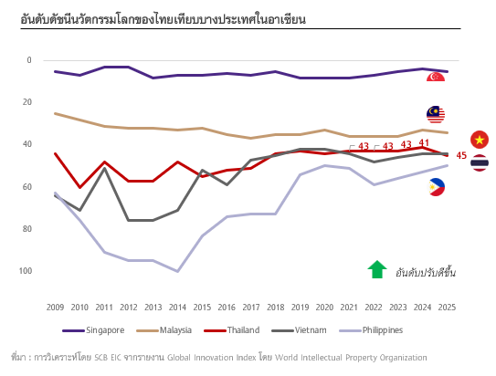 (1) อันดับของไทยในดัชนีนวัตกรรมโลก (Global Innovation Index) โดย World Intellectual Property Organization (WIPO) ที่ปรับลดลงเป็นปีที่ 3 โดยในปี 2025 ไทยร่วงลง 4 อันดับ มาอยู่ที่อันดับ 45 จาก 139 ประเทศ ขณะที่ประเทศคู่แข่งสำคัญในภูมิภาค เช่น เวียดนาม สามารถพัฒนานวัตกรรมได้ต่อเนื่องและแซงไทยขึ้นมาได้ในปีเดียวกัน (รูปที่ 1)