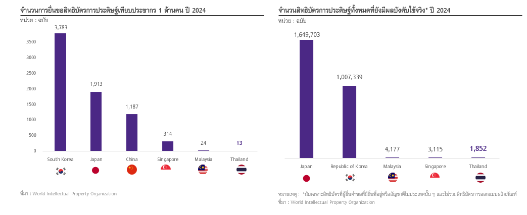 • (2) สัดส่วนการลงทุนวิจัยและพัฒนา (R&D) ในไทยยังต่ำกว่า 2% ต่อ GDP ซึ่งเป็นเป้าหมายระยะกลางของประเทศ (3) จำนวนบุคลากรด้านการวิจัยและพัฒนาของไทยเริ่มส่งสัญญาณชะลอตัวลง โดยลดลงเหลือเพียง 23 คนต่อประชากร 10,000 คน (ข้อมูลปี 2023) สะท้อนปัจจัยพื้นฐานในการสร้างนวัตกรรมใหม่ที่อ่อนแอลงต่อเนื่อง และ (4) จำนวนการยื่นขอสิทธิบัตรต่อประชากร 1 ล้านคนที่อยู่ในระดับต่ำเพียง 13 ฉบับ (ข้อมูลปี 2024) และจำนวนสิทธิบัตรที่ยังมีผลบังคับใช้ในปัจจุบันอยู่ในระดับต่ำ