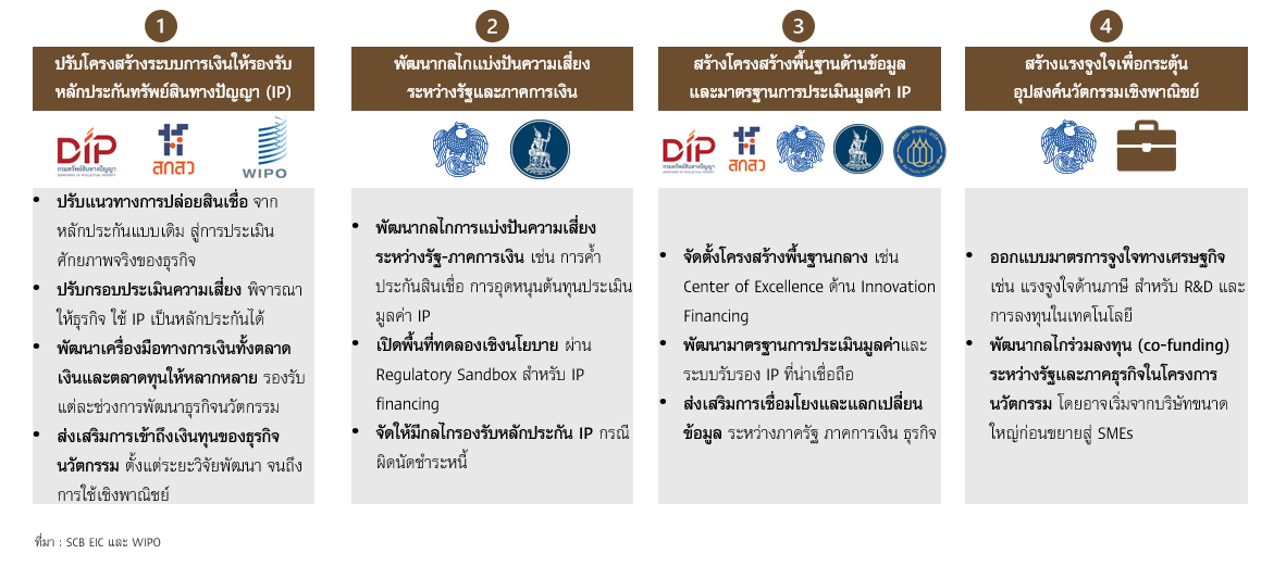 การผลักดันให้ทรัพย์สินทางปัญญาและนวัตกรรมสามารถขับเคลื่อนเศรษฐกิจไทยได้จริง จำเป็นต้องออกแบบและปรับกลไกระบบการเงินให้รองรับเศรษฐกิจที่ขับเคลื่อนด้วยนวัตกรรมใหม่ ซึ่งไม่ใช่แค่การจัดสรรเงินทุนเพิ่มเติม แต่คือการทำให้ระบบการเงิน “กล้าให้เงินทุน” และภาคธุรกิจ “กล้าลงทุน” ในจังหวะเดียวกัน ผ่าน 4 เสาหลัก ดังนี้