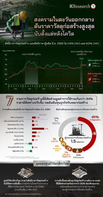 ศูนย์วิจัยกสิกรไทย คาดว่าดัชนีราคาวัสดุก่อสร้างจะยังคงมีทิศทางเพิ่มขึ้น โดยในช่วง Q2/2569 อาจปรับเพิ่ม 5-8% (YoY) โดยเฉพาะเหล็ก ผลิตภัณฑ์คอนกรีต และซีเมนต์