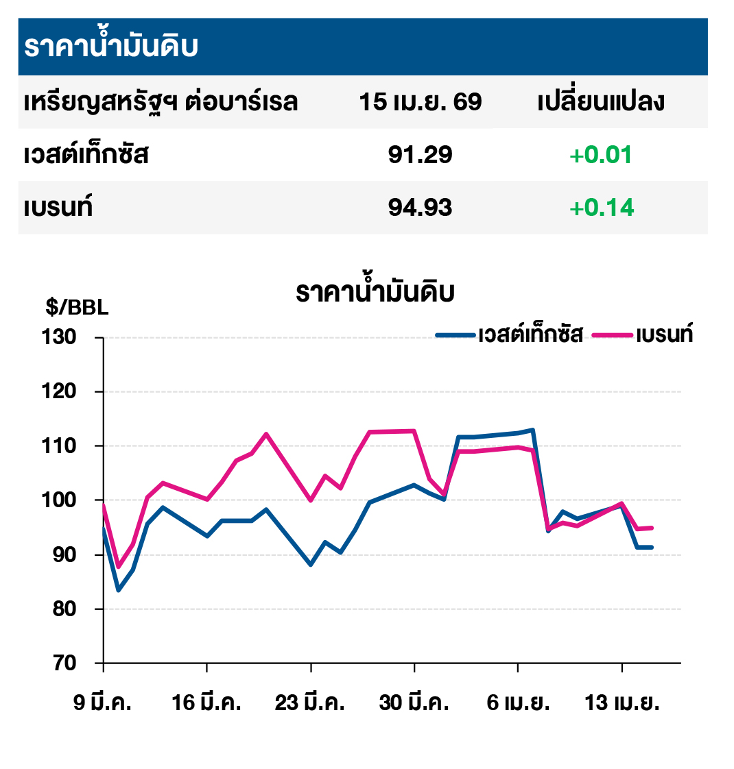 (-/+) ราคาน้ำมันดิบทรงตัว หลังสหรัฐฯและอิหร่านกำลังพิจารณาขยายเวลาการหยุดยิงออกไปอีก 2 สัปดาห์ เพื่อให้มีเวลามากขึ้นในการเจรจาข้อตกลงสันติภาพ ขณะที่คนกลางในการเจรจา (Mediator) ยังคงพยายามจัดการเจรจาเพื่อให้เกิดการประนีประนอมในประเด็นที่เกี่ยวข้องกับโครงการนิวเคลียร์ของอิหร่าน โดยอิหร่านยืนยันสิทธิ์ในการเสริมสมรรถนะยูเรเนียมเพื่อการใช้งานด้านพลเรือน ขณะที่สหรัฐฯ ต้องการห้ามเพื่อป้องกันการพัฒนาอาวุธนิวเคลียร์