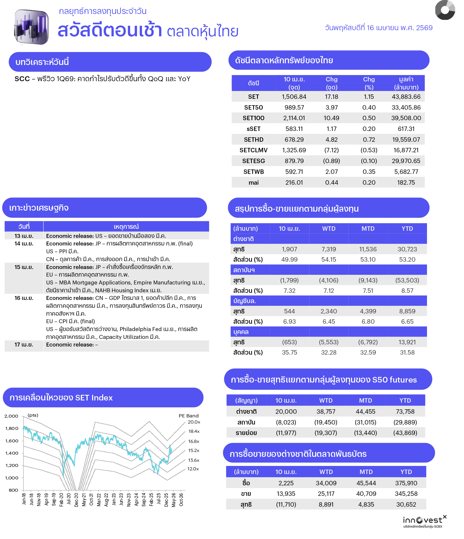 คาด SET ปรับขึ้น นักลงทุนเข้าสู่ภาวะ Risk on ความตึงเครียดผ่อนคลายลง หลังสหรัฐฯและอิหร่านเปิดทางพร้อมกลับมาเจรจาเพื่อยุติสงครามอีกรอบ รวมทั้งคาดหวัง ปธน. ทรัมป์ ผลักดันเปิดช่องแคบฮอร์มุซอย่างถาวรเพื่อลดผลกระทบต่อตลาดน้ำมันโลก ขณะที่ปัจจัยในประเทศติดตามการเข้าสู่ช่วงรายงานงบ 1Q69 เริ่มที่กลุ่มธนาคาร โดยวันนี้ TISCO จะรายงานเป็นแห่งแรก ทางเทคนิคดัชนีไต่ระดับขึ้นต่อเนื่อง ประเมินแนวต้าน 1525-1535 แนวรับ 1495-1485