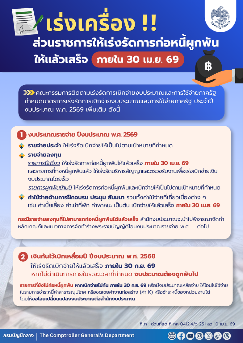 อธิบดีกรมบัญชีกลางกล่าวเพิ่มเติมว่า เพื่อเป็นการเร่งอัดฉีดเม็ดเงินเข้าสู่ระบบเศรษฐกิจโดยเร็ว คณะกรรมการติดตามเร่งรัดการเบิกจ่ายงบประมาณและการใช้จ่ายภาครัฐได้กำหนดมาตรการเร่งรัดการเบิกจ่ายงบประมาณและการใช้จ่ายภาครัฐ ประจำปีงบประมาณ พ.ศ. 2569 เพิ่มเติม เพื่อเร่งรัดการก่อหนี้ผูกพันของส่วนราชการให้เป็นไปตามเป้าหมายที่กำหนด โดยกำหนดให้ส่วนราชการเร่งรัดเบิกจ่ายรายจ่ายประจำให้เป็นไปตามเป้าหมายที่กำหนด ในส่วนของรายจ่ายลงทุน รายการปีเดียวให้เร่งรัดการก่อหนี้ผูกพันให้แล้วเสร็จ ภายในวันที่ 30 เมษายน 2569 และรายการที่ก่อหนี้ผูกพันแล้ว ให้เร่งรัดบริหารสัญญาและตรวจรับงานเพื่อเร่งเบิกจ่ายเงินงบประมาณโดยเร็ว สำหรับรายการผูกพันข้ามปีให้เร่งรัดการก่อหนี้ผูกพันและเบิกจ่ายให้เป็นไปตามเป้าหมายที่กำหนด นอกจากนั้นยังได้กำหนดให้ส่วนราชการเบิกจ่ายค่าใช้จ่ายด้านการฝึกอบรม ประชุม สัมมนา รวมทั้งค่าใช้จ่ายที่เกี่ยวเนื่องต่าง ๆ เช่น ค่าเบี้ยเลี้ยง ค่าเช่าที่พัก ค่าพาหนะ เป็นต้น ให้แล้วเสร็จ ภายในวันที่ 30 เมษายน 2569 ทั้งนี้ กรณีรายจ่ายลงทุนที่ไม่สามารถก่อหนี้ผูกพันได้แล้วเสร็จ ให้สำนักงบประมาณนำไปพิจารณาจัดทำหลักเกณฑ์และแนวทางการจัดทำร่างพระราชบัญญัติโอนงบประมาณรายจ่าย พ.ศ. .... ต่อไป