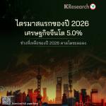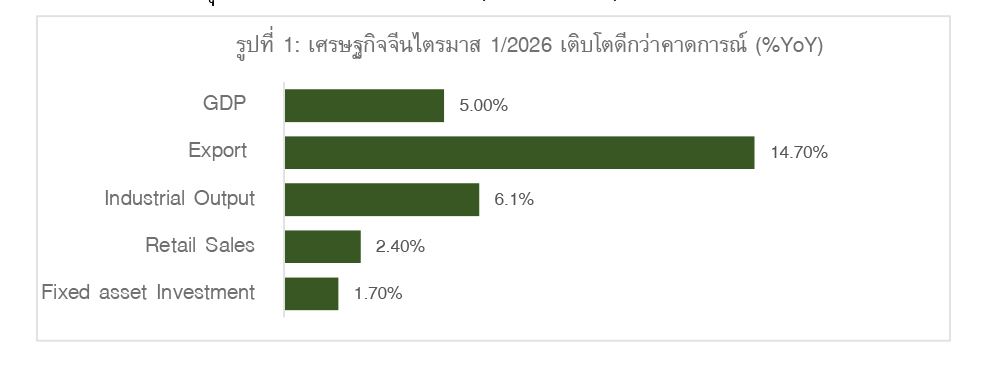 ในไตรมาสแรกของปี 2026 เศรษฐกิจจีนขยายตัวอยู่ที่ 5.0%YoY เร่งตัวขึ้นจาก 4.5%YoY ในไตรมาส 4 ของปี 2025 (รูปที่ 1) ได้รับปัจจัยหนุนสำคัญจากภาคการผลิต และภาคการส่งออกโดยมีรายละเอียดที่สำคัญ ดังนี้