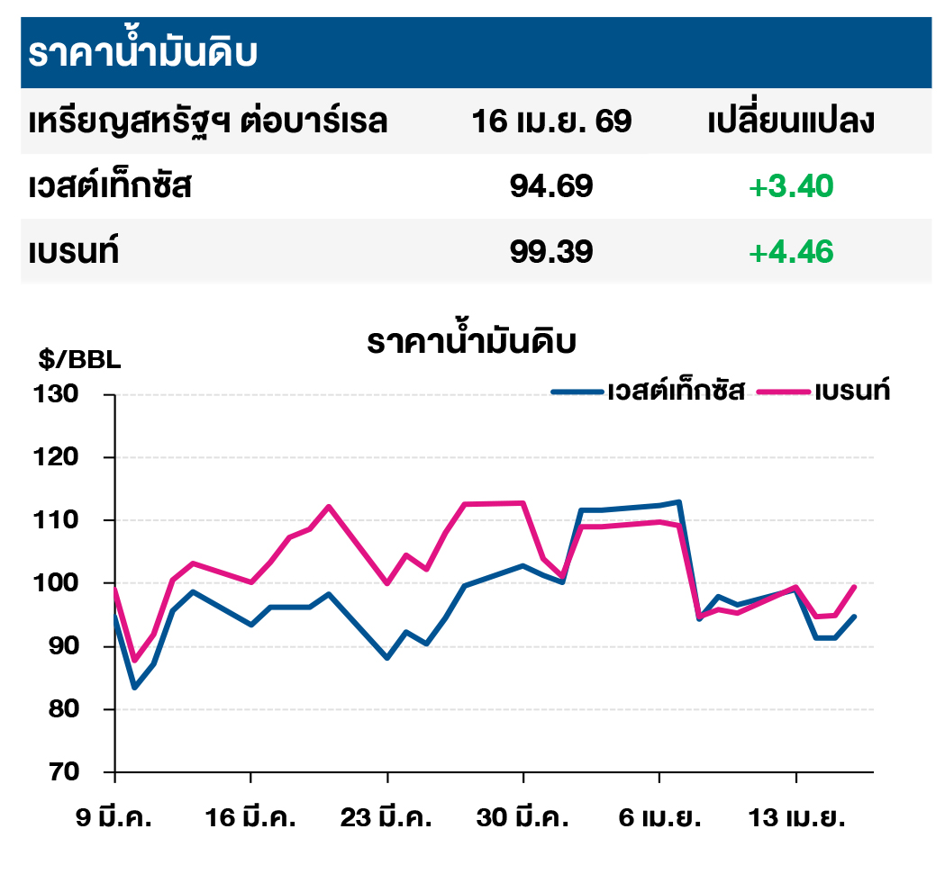 (+) ราคาน้ำมันดิบเวสต์เท็กซัส และเบรนท์ปรับเพิ่ม หลังตลาดยังไม่เชื่อว่าการเจรจาระหว่างสหรัฐฯ–อิหร่านจะนำไปสู่ข้อตกลงได้ในระยะสั้น แม้กระทรวงการต่างประเทศปากีสถานออกแถลงการณ์ว่า สหรัฐฯ และอิหร่านกำลังหารือกันผ่านทางปากีสถานเพื่อจัดการเจรจารอบที่สอง โดยประเด็นนิวเคลียร์จะยังคงเป็นหนึ่งในหัวข้อสำคัญของการหารือ รวมถึงการที่อิสราเอลและเลบานอนบรรลุข้อตกลงหยุดยิงเป็นเวลา 10 วัน ที่จะเริ่มตั้งแต่วันที่ 17 เม.ย. 69 อย่างไรก็ดี ตลาดยังให้น้ำหนักกับความเสี่ยงที่ปริมาณน้ำมันในตลาดจะลดลง มากกว่าข่าวเชิงบวกด้านการทูต