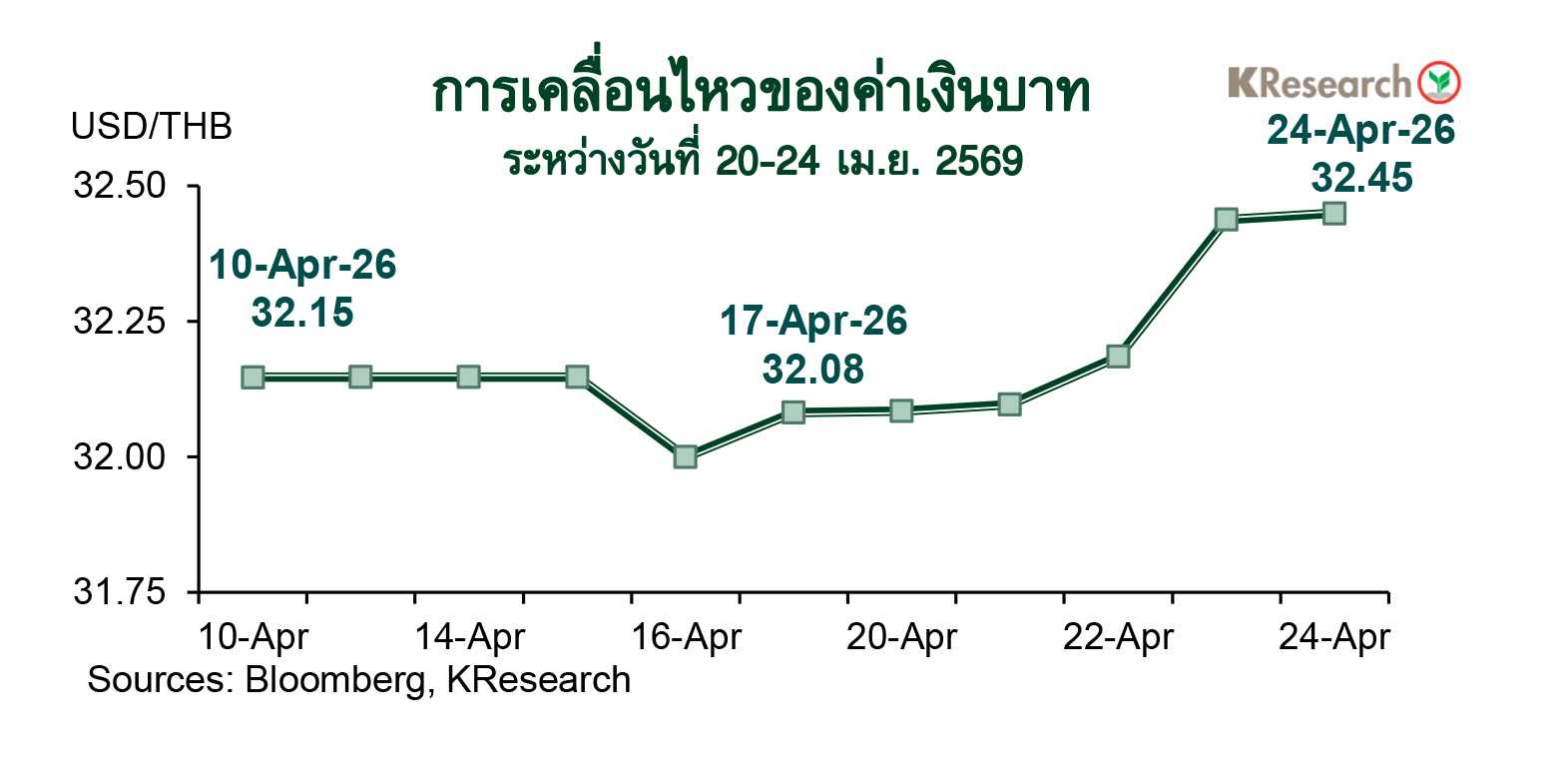 · ในวันศุกร์ที่ 24 เม.ย. 2569 เงินบาทแตะระดับอ่อนค่าสุดในรอบ 2 สัปดาห์ที่ 32.51 ก่อนจะปิดตลาดในประเทศที่ 32.45 บาทต่อดอลลาร์ฯ เทียบกับระดับ 32.08 บาทต่อดอลลาร์ฯ ในวันศุกร์ก่อนหน้า (17 เม.ย.) สำหรับสถานะพอร์ตการลงทุนของนักลงทุนต่างชาติระหว่างวันที่ 20-24 เม.ย. 2569 นั้น นักลงทุนต่างชาติขายสุทธิหุ้นไทย 7,159 ล้านบาท แต่มีสถานะอยู่ในฝั่ง Net Inflows เข้าตลาดพันธบัตรไทย 4,260 ล้านบาท (ซื้อสุทธิพันธบัตร 4,263 ล้านบาท หักตราสารหนี้หมดอายุ 3 ล้านบาท)