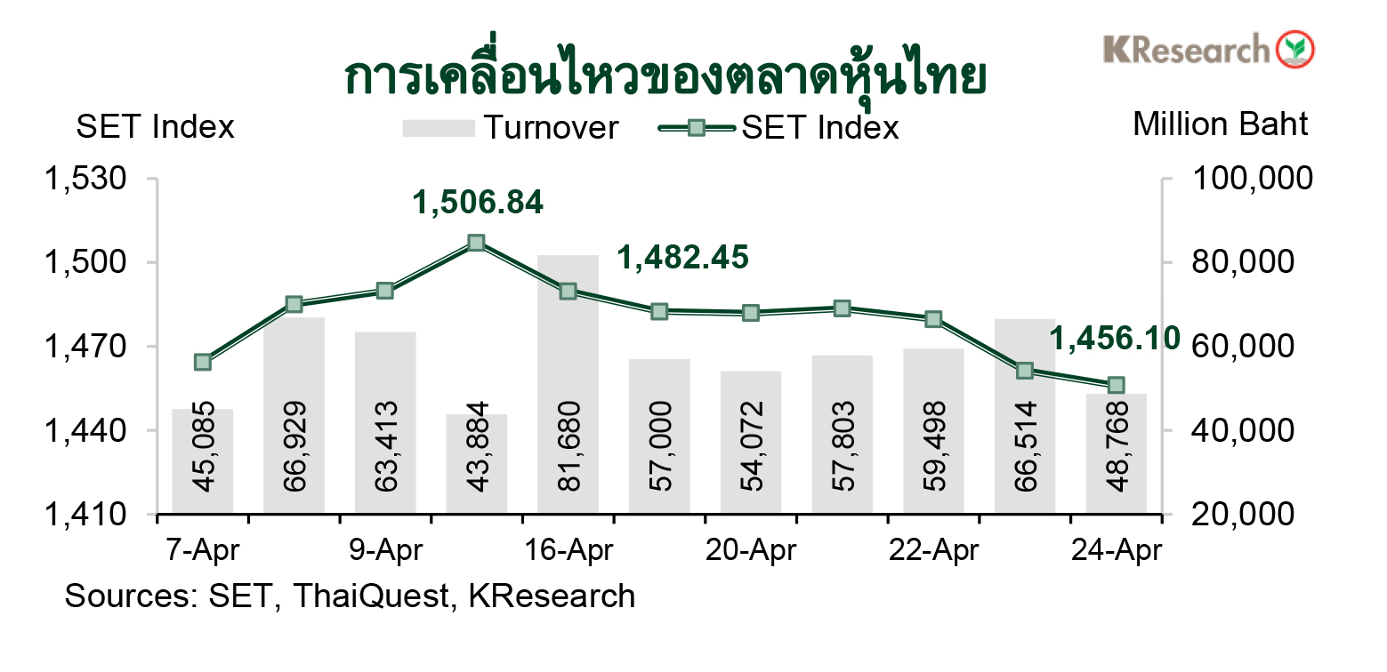· สัปดาห์ถัดไป (27 เม.ย.-1 พ.ค. 2569) บริษัทหลักทรัพย์กสิกรไทย จำกัด มองว่า ดัชนีหุ้นไทยมีแนวรับที่ 1,430 และ 1,415 จุด ขณะที่แนวต้านอยู่ที่ 1,470 และ 1,495 จุด ตามลำดับ โดยศูนย์วิจัยกสิกรไทยประเมินปัจจัยสำคัญที่ต้องติดตาม ได้แก่ การประชุมเฟด (28-29 มี.ค.) การประชุมกนง. ผลประกอบการไตรมาส 1/2569 ของบจ.ไทย สถานการณ์ในตะวันออกกลางและทิศทางเงินทุนต่างชาติ ส่วนตัวเลขเศรษฐกิจสหรัฐฯ ที่สำคัญ ได้แก่ ยอดสั่งซื้อสินค้าคงทน ข้อมูลการเริ่มสร้างบ้าน ดัชนีราคา PCE/Core PCE เดือนมี.ค. ดัชนี ISM และ PMI ภาคการผลิตเดือนเม.ย. ตัวเลขจีดีพีไตรมาส 1/2569 รวมถึงจำนวนผู้ขอรับสวัสดิการว่างงานรายสัปดาห์ ขณะที่ปัจจัยเศรษฐกิจต่างประเทศอื่น ๆ ได้แก่ การประชุม BOJ BOE และ ECB กำไรบริษัทอุตสาหกรรมเดือนมี.ค. และดัชนี PMI ภาคการผลิตเดือนเม.ย.ของจีน ตลอดจนตัวเลขจีดีพีไตรมาส 1/2569 และดัชนีราคาผู้บริโภคเดือนเม.ย. (เบื้องต้น) ของยูโรโซน