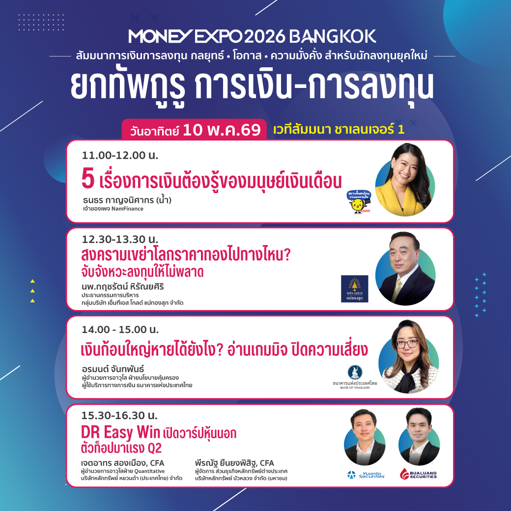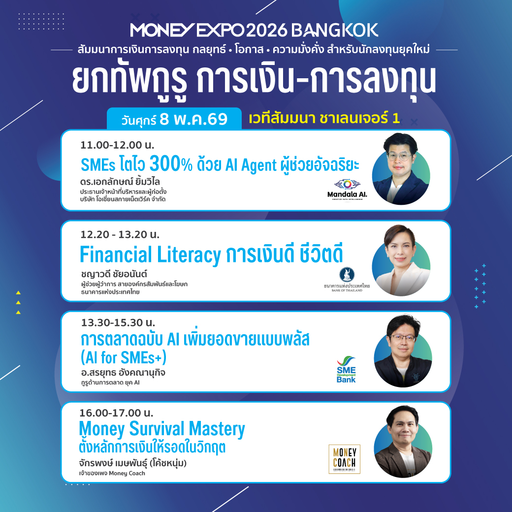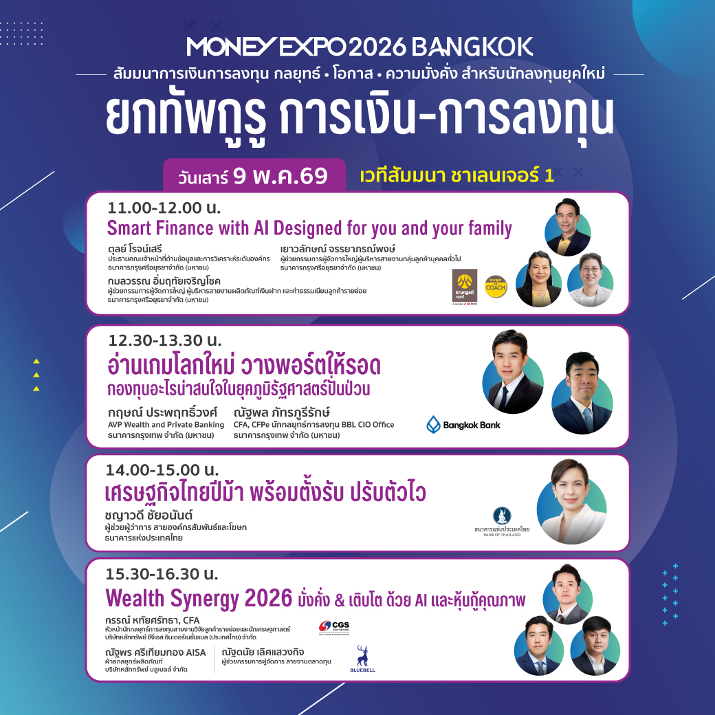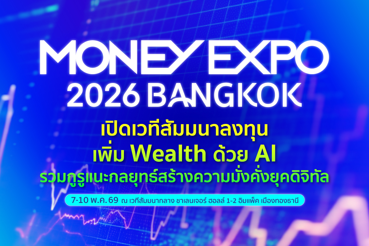งานมหกรรมการเงินกรุงเทพ ครั้งที่ 26 MONEY EXPO 2026 BANGKOK จัดเวทีสัมมนาลงทุนเพิ่ม Wealth ด้วย AI สุดเข้มข้น ระดมผู้เชี่ยวชาญ นักลงทุน นักวิเคราะห์ และอินฟลูเอ็นเซอร์ด้านการเงินการลงทุนชั้นนำของประเทศ ร่วมถ่ายทอดองค์ความรู้ เจาะลึกแนวโน้มเศรษฐกิจ การบริหารความมั่งคั่ง และโอกาสการลงทุนยุคใหม่ วันที่ 7-10 พฤษภาคม 2569 ณ เวทีสัมมนากลางชาเลนเจอร์ ฮอลล์ 1-2 อิมแพ็ค เมืองทองธานี ฟังฟรี! ตลอดงาน