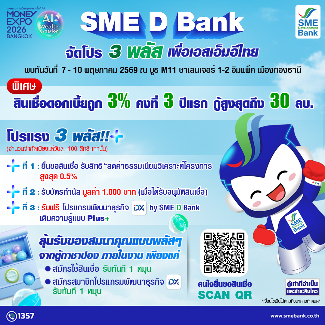 ธนาคารพัฒนาวิสาหกิจขนาดกลางและขนาดย่อมแห่งประเทศไทย (ธพว.) หรือ SME D Bank ยกขบวนสินเชื่อดอกเบี้ยถูกพิเศษ เพื่อเอสเอ็มอีไทย เพียง 3%ต่อปี คงที่ตลอด 3 ปีแรก ผ่อนชำระนานสูงสุด 10 ปี วงเงินกู้สูงสุดถึง 30 ล้านบาท เน้นสนับสนุนปรับเปลี่ยนธุรกิจใช้พลังงานสะอาด พร้อมเสิร์ฟในงาน "มหกรรมการเงินกรุงเทพ ครั้งที่ 26" (MONEY EXPO 2026 BANGKOK) ระหว่างวันที่ 7-10 พฤษภาคม 2569 ณ บูธหมายเลข M 11 ชาเลนเจอร์ 1-2 อิมแพ็ค เมืองทองธานี ไฮไลท์ คือ สินเชื่อ “SME Green Productivity” ช่วยลดต้นทุนธุรกิจ และสร้างความยั่งยืน นำไปใช้ได้ทั้งเสริมสภาพคล่อง ลงทุน ปรับปรุง เช่น ติดตั้งโซลาร์เซลล์ ซื้อเครื่องจักรอุปกรณ์ เปลี่ยนใช้ยานพาหนะพลังงานสะอาด เป็นต้น , สินเชื่อ “ปลุกพลัง SME” อุ้มเอสเอ็มอีรายเล็กเข้าถึงแหล่งทุน โดยไม่ต้องใช้หลักทรัพย์ค้ำประกัน และ สินเชื่อ “Beyond ติดปีก SME” เติมทุนลงทุน ขยาย ปรับปรุงเสริมสภาพคล่องยกระดับกิจการ