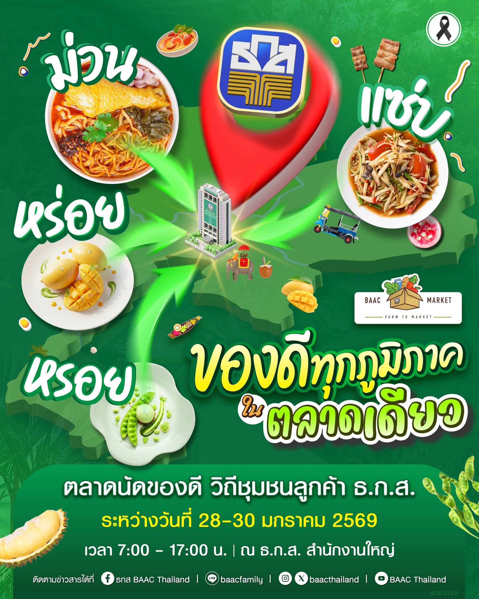 ธ.ก.ส. ยกขบวนสินค้าเกษตร สินค้าชุมชน และผลิตภัณฑ์แปรรูปคุณภาพ ที่มีเอกลักษณ์เฉพาะถิ่น ส่งตรงจากเกษตรกรและผู้ประกอบการลูกค้า ธ.ก.ส. ถึงมือผู้บริโภคโดยตรงกว่า 60 ร้านค้าทั่วทุกภูมิภาค รวมไว้ในงานตลาดนัดของดีวิถีชุมชน ภายใต้ธีม "ของดีภูมิภาค" ระหว่างวันที่ 28 - 30 มกราคม 2569 ณ บริเวณด้านหน้า ธ.ก.ส. สำนักงานใหญ่ กรุงเทพ