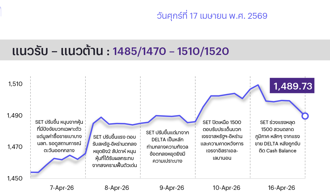 คาด SET แกว่งตัว sideways-up โดยคาดมีแรงซื้อกลับในหุ้นที่ลงแรงวานนี้ ขณะที่ ปธน. ทรัมป์ระบุอิสราเอลและเลบานอนบรรลุข้อตกลงหยุดยิง 10 วัน น่าจะช่วยผ่อนคลายสถานการณ์ตะวันออกกลางได้มากขึ้น แต่ตลาดยังมีความผันผวนจากความไม่ชัดเจนของการเจรจาสหรัฐฯ และอิหร่านรอบ 2 ที่ยังไม่ถูกกำหนดวัน