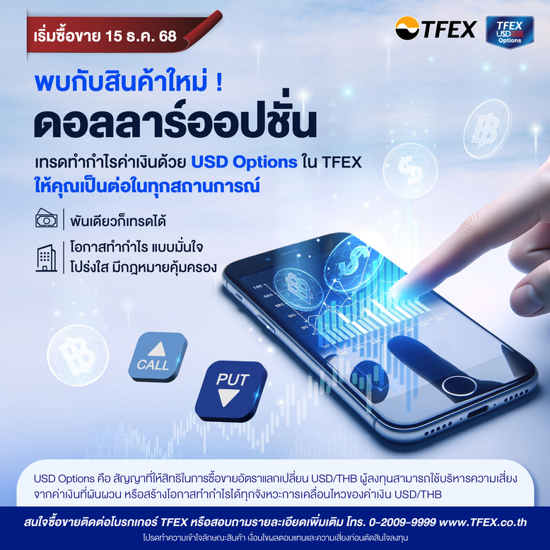 TFEX พร้อมเปิดซื้อขายสินค้าใหม่ "ดอลลาร์บาทออปชัน" (USD/THB Options) เพื่อเป็นอีกทางเลือกสำหรับผู้ลงทุนหรือผู้ประกอบธุรกิจนำเข้าส่งออก ในการใช้บริหารจัดการค่าเงิน โดยจะเริ่มซื้อขาย 15 ธ.ค. 2568