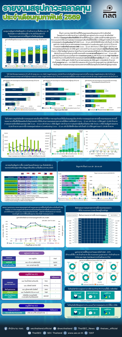รายงานสรุปข้อมูลสำคัญเกี่ยวกับตลาดทุน เช่น มูลค่าหลักทรัพย์ตามราคาตลาดของตราสารทุน มูลค่าคงค้างของตลาดตราสารหนี้ มูลค่า IPO ฯลฯ เพื่อเป็นข้อมูลให้ได้ติดตามเป็นประจำทุกเดือน