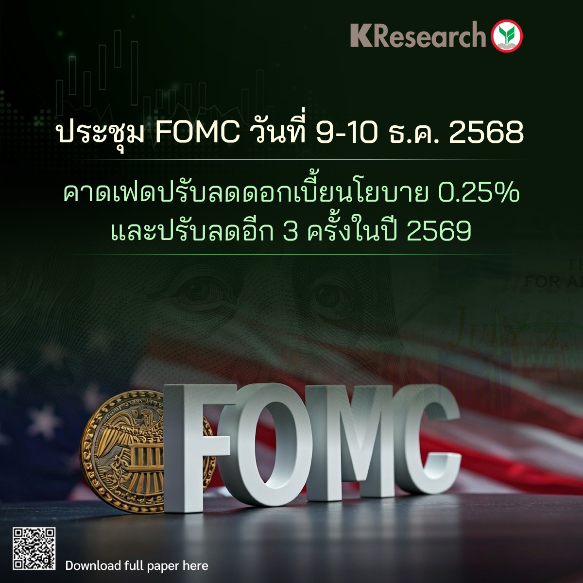 ศูนย์วิจัยกสิกรไทยวิเคราะห์ "ประชุม FOMC วันที่ 9-10 ธ.ค. คาดเฟดปรับลดดอกเบี้ยนโยบาย 0.25% และปรับลดอีก 3 ครั้งในปี 2569"