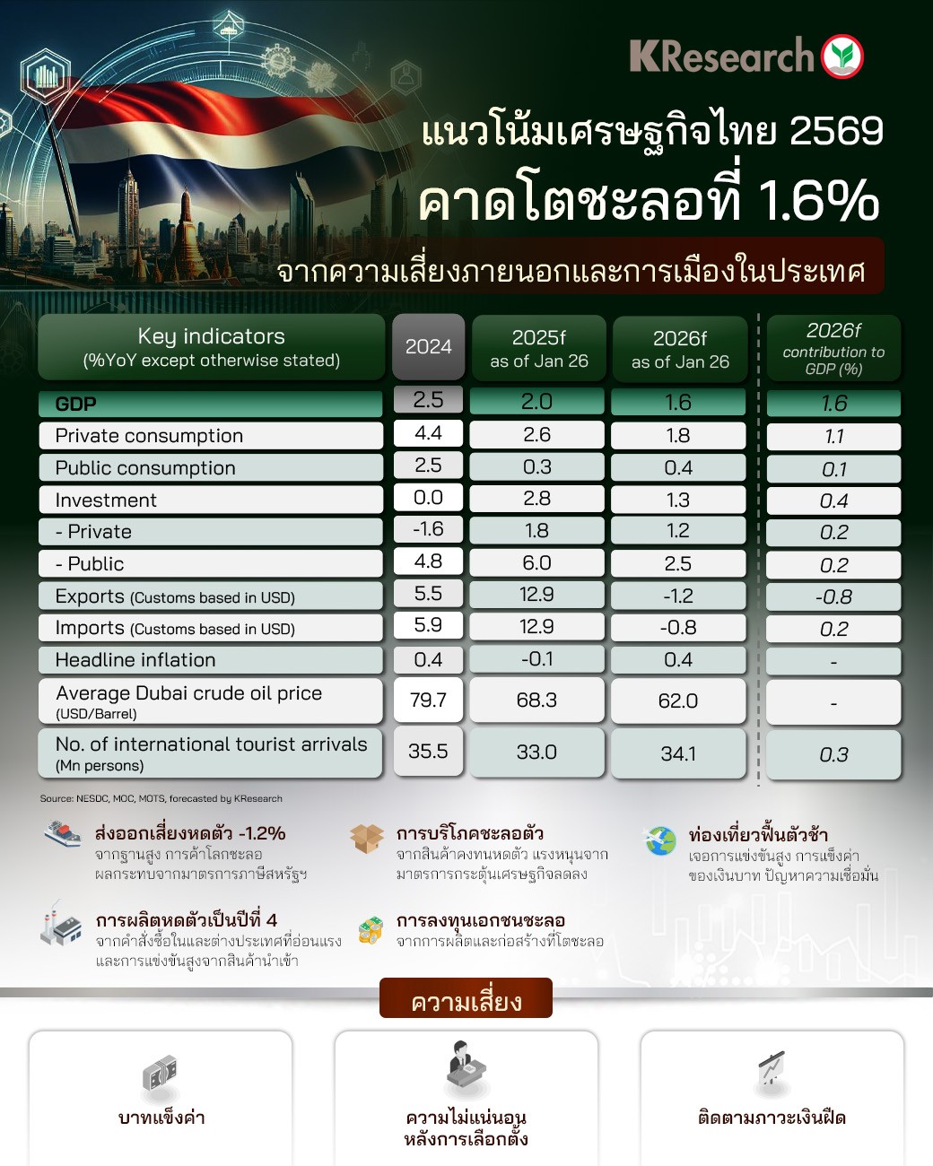 เศรษฐกิจไทยในปี 2569 คาดว่าจะขยายตัวชะลอลงเหลือราว 1.6% จาก 2.0% ในปีก่อนหน้า โดยมีแรงกดดันสำคัญจากภ...