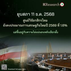 ยุบสภา 11 ธ.ค. 68 ศูนย์วิจัยกสิกรไทยยังคงประมาณการเศรษฐกิจไทยปี 2569 ที่ 1.6% แต่ขึ้นอยู่กับความไม่แน่นอนหลังเลือกตั้ง