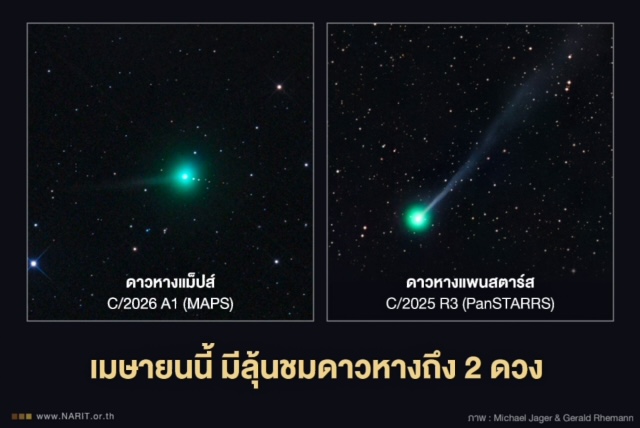 สถาบันวิจัยดาราศาสตร์แห่งชาติ (องค์การมหาชน) (สดร.) หรือ NARIT กระทรวงการอุดมศึกษา วิทยาศาสตร์ วิจัยและนวัตกรรม (อว.) เผย เมษายนนี้ คนไทยมีลุ้นได้ชมดาวหางถึง 2 ดวง ได้แก่ "ดาวหางแม็ปส์" หรือ C/2026 A1 (MAPS) ช่วงต้นเดือน