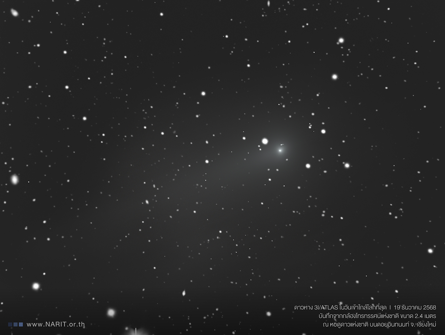 สถาบันวิจัยดาราศาสตร์แห่งชาติ (องค์การมหาชน) (สดร. หรือ NARIT) กระทรวงการอุดมศึกษา วิทยาศาสตร์ วิจัย และนวัตกรรม (อว.) เผยภาพดาวหาง 3I/ATLAS ในวันเข้าใกล้โลกที่สุด บันทึกในช่วงเช้ามืด วันที่ 19 ธันวาคม 2568 โดยกล้องโทรทรรศน์แห่งชาติ ขนาด 2.4 เมตร บนดอยอินทนนท์ จังหวัดเชียงใหม่