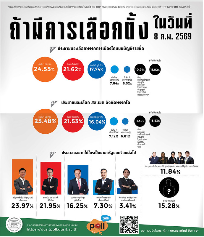 "สวนดุสิตโพล" มหาวิทยาลัยสวนดุสิต สำรวจความคิดเห็นประชาชนทั่วประเทศ เรื่อง "ถ้ามีการเลือกตั้งใน วันที่ 8 ก.พ. 2569" กลุ่มตัวอย่าง จำนวน 2,232 คน (สำรวจทางออนไลน์และภาคสนาม) ระหว่างวันที่ 16-19 ธันวาคม 2568 สรุปผลได้ ดังนี้