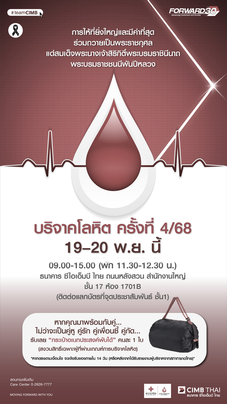 ธนาคาร ซีไอเอ็มบี ไทย จัดกิจกรรมบริจาคโลหิต วันที่ 19-20 พ.ย. 2568 ระหว่างเวลา 09.00-15.00 น. ที่ ธนาคาร ซีไอเอ็มบี ไทย สำนักงานใหญ่ หลังสวน ชั้น 17 ห้องประชุม 1701B ไฮไลต์ครั้งนี้ ผู้บริจาคที่มาด้วยกันเป็นคู่ หรือจะเป็นหมู่คณะ รับกระเป๋าอเนกประสงค์พับได้ จำนวนจำกัด ไปเลยทุกคน (สำหรับผู้ที่ผ่านเกณฑ์บริจาคเท่านั้น)