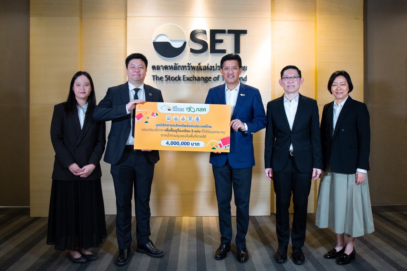 มูลนิธิตลาดหลักทรัพย์แห่งประเทศไทย โดยนายอัสสเดช คงสิริ กรรมการและเลขานุการ มูลนิธิฯ พร้อมด้วยผู้บริหารมูลนิธิฯ มอบเงินสนับสนุนจำนวน 4 ล้านบาท ผ่านกองทุนเพื่อความเสมอภาคทางการศึกษา (กสศ.) เพื่อช่วยเหลือฟื้นฟูโรงเรียน 5 แห่งในจังหวัดสงขลา ที่ประสบภัยน้ำท่วมรุนแรงเมื่อปลายปี 2568
