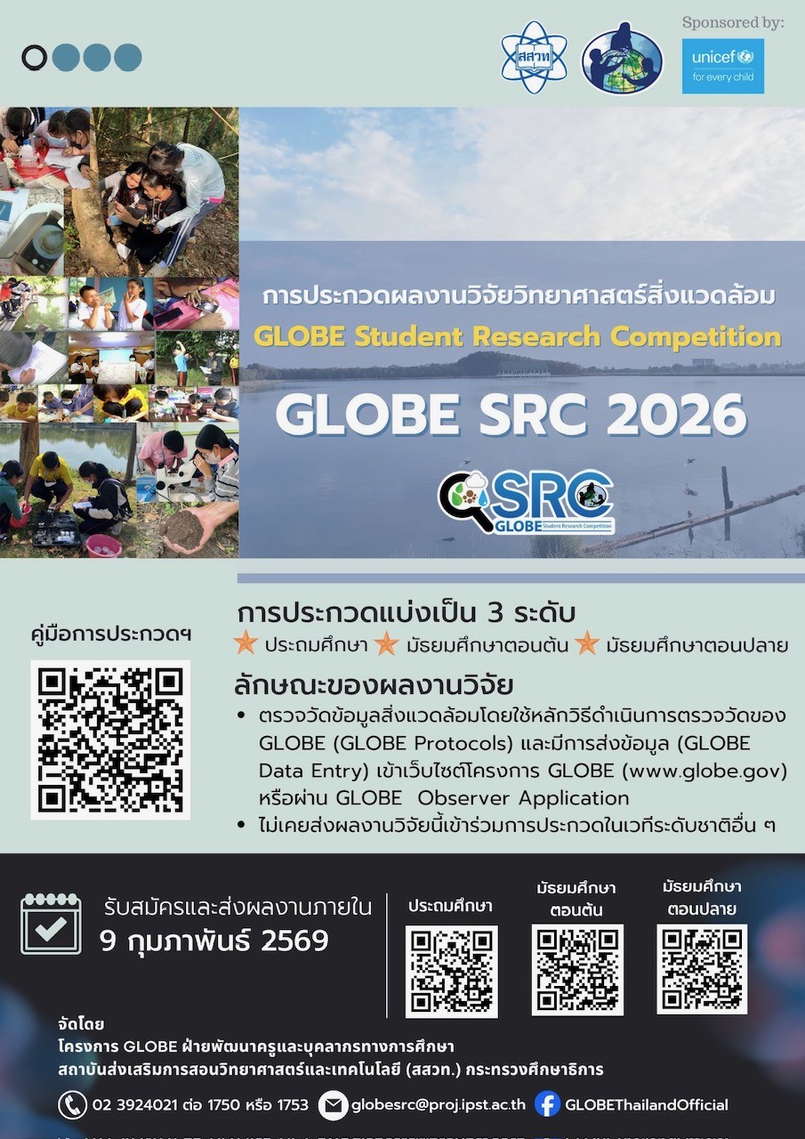 สถาบันส่งเสริมการสอนวิทยาศาสตร์และเทคโนโลยี (สสวท.) ขอเชิญนักเรียนระดับประถมศึกษาปีที่ 4 ถึงมัธยมศึกษาปีที่ 6 ทั่วประเทศ สมัครเข้าร่วมการประกวดผลงานวิจัยวิทยาศาสตร์สิ่งแวดล้อม ประจำปี 2569 "GLOBE Student Research Competition 2026" (GLOBE SRC 2026)