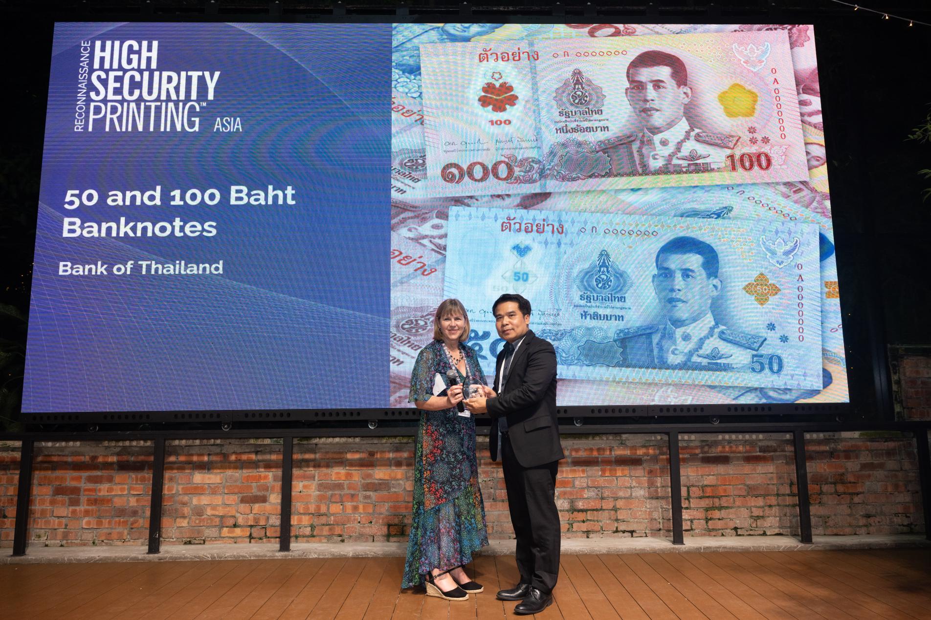 ธนบัตรพอลิเมอร์ชนิดราคา 100 บาท และ 50 บาท ของประเทศไทย ได้รับรางวัล "Best New Banknote 2025" จากงานประชุม High Security Printing Asia ครั้งที่ 25 ซึ่งจัดขึ้น ณ ประเทศมาเลเซีย โดยรางวัลดังกล่าวสะท้อนถึงความสำเร็จของประเทศไทยในการพัฒนาเทคโนโลยีธนบัตรที่ทันสมัย มีความปลอดภัยสูง