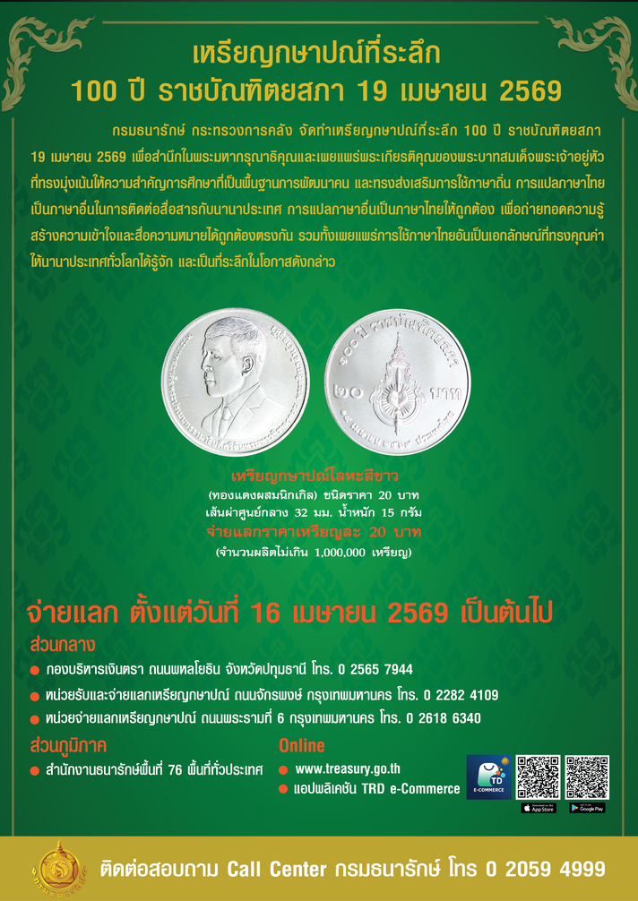 นายอัครุตม์ สนธยานนท์ อธิบดีกรมธนารักษ์ เปิดเผยว่ากรมธนารักษ์ กระทรวงการคลัง จัดทำเหรียญกษาปณ์ที่ระลึก 100 ปี ราชบัณฑิตยสภา 19 เมษายน 2569 เพื่อน้อมสำนึกในพระมหากรุณาธิคุณและเผยแพร่พระเกียรติคุณของพระบาทสมเด็จพระเจ้าอยู่หัว ที่ทรงมุ่งเน้นให้ความสำคัญการศึกษาที่เป็นพื้นฐานการพัฒนาคน
