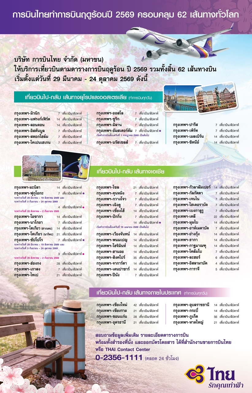 บริษัท การบินไทย จำกัด (มหาชน) ให้บริการเที่ยวบินตามตารางการบินฤดูร้อน ปี 2569 รวมทั้งสิ้น 62 เส้นทา...