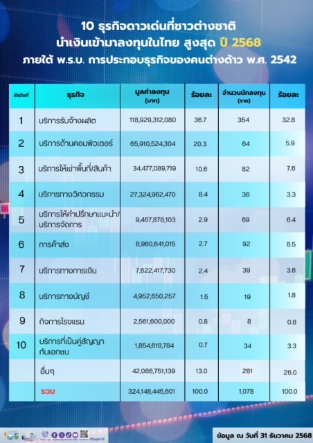 กรมพัฒนาธุรกิจการค้า เปิด 10 ธุรกิจดาวเด่นที่ชาวต่างชาตินำเงินเข้ามาลงทุนในไทยสูงสุด รอบปี 2568 ภายใต้ พ.ร.บ. การประกอบธุรกิจของคนต่างด้าว พ.ศ. 2542 ธุรกิจรับจ้างผลิตนำโด่ง ลงทุนกว่า 1.19 แสนล้านบาท ตามด้วยธุรกิจบริการด้านคอมพิวเตอร์ เช่น พัฒนาซอฟต์แวร์ Data Center รวม 10 ธุรกิจยอดนิยมมีมูลค่าการลงทุนรวมกว่า 2.82 แสนล้านบาท