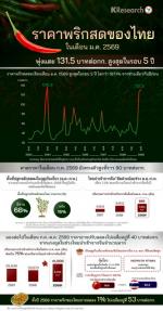 ราคาพริกสดของไทยในเดือนม.ค. 2569 พุ่งแตะ 131.5 บาทต่อกก. สูงสุดในรอบ 5 ปี และคาดว่าราคาในเดือนก.พ. 2569 จะยังทรงตัวสูงที่ราว 90 บาทต่อกก. เนื่องจากพื้นที่ปลูกหลักในภาคอีสานและภาคเหนือลดลงในฤดูเก็บเกี่ยว (ม.ค.-ก.พ.) จากผลกระทบน้ำท่วมหนักตั้งแต่ต.ค. 2568 ฟื้นฟูไม่ทัน