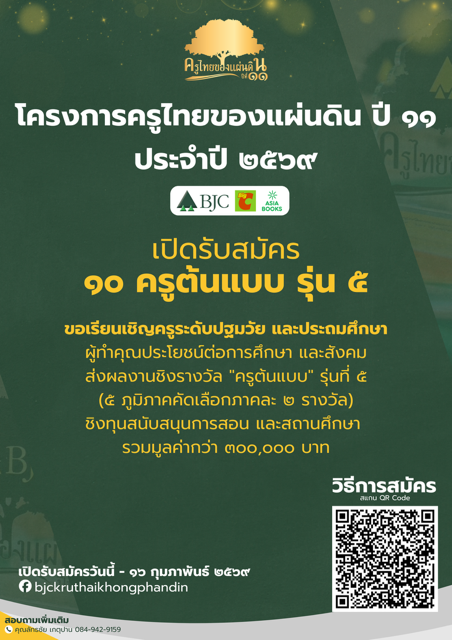 กลุ่มบีเจซี บิ๊กซี เดินหน้าสานต่อปณิธานด้านการศึกษาอย่างต่อเนื่องกว่า 1 ทศวรรษ ประกาศเปิดรับสมัคร "ครูต้นแบบ รุ่นที่ 5" ภายใต้โครงการ "บีเจซี ครูไทยของแผ่นดิน ประจำปี 2569" เพื่อเปิดโอกาสให้ครูและบุคลากรทางการศึกษาระดับปฐมวัยและประถมศึกษาจากทั่วประเทศ ได้แสดงศักยภาพ แนวคิด และหัวใจความเป็นครู