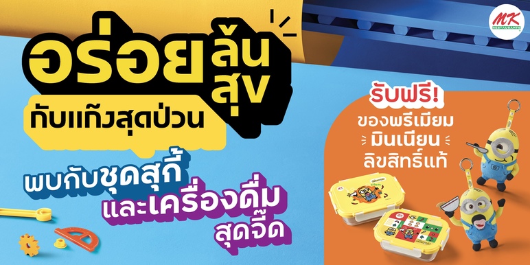 ปฎิบัติการณ์ป่วนทั่วไทย MK Restaurants เสิร์ฟกลยุทธ์ Brand Collaboration กับมินเนี่ยน คาแรกเตอร์ดังระดับโลก ร่วมแคมเปญ ?อร่อยล้นสุขกับแก๊งสุดป่วน? ปล่อยเมนูพิเศษให้ทานได้ที่ร้านทั้งสาขาปกติ และสาขาที่ร่วมรายการ โปรโมชั่น คุ้มเกินคุ้ม 299 บาท ทั้งเมนู ลูกชิ้น Minions, ซาลาเปา Minions