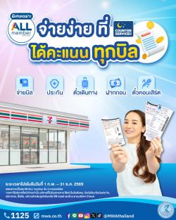 กปน. จับมือ เคาน์เตอร์เซอร์วิส แจกคะแนนพิเศษ แก่สมาชิก ALL member เมื่อจ่ายบิลค่าน้ำประปา ที่ร้าน 7-11 ทุกสาขา ทั่วประเทศ ตั้งแต่บัดนี้ ถึง 31 ธ.ค. 69