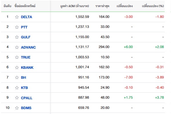 ตลาดหุ้นไทยปิดภาคเช้าวันนี้ (24 ก.ย.68) ดัชนีอยู่ที่ 1,277.32 จุด บวก 4.12 จุด หรือเพิ่มขึ้น 0.32% มูลค่าการซื้อขาย 23,017.00 ล้านบาท 10 อันดับหลักทรัพย์ที่มีมูลค่าการซื้อขายสูงสุด